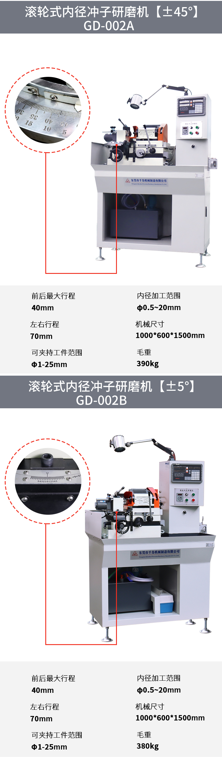 GD-001A滾輪式外徑?jīng)_子研磨機適用于沖頭、噴嘴、微小心軸、相關(guān)零組件微小外徑研磨。配置大角度(±45°)加工范圍更靈活。